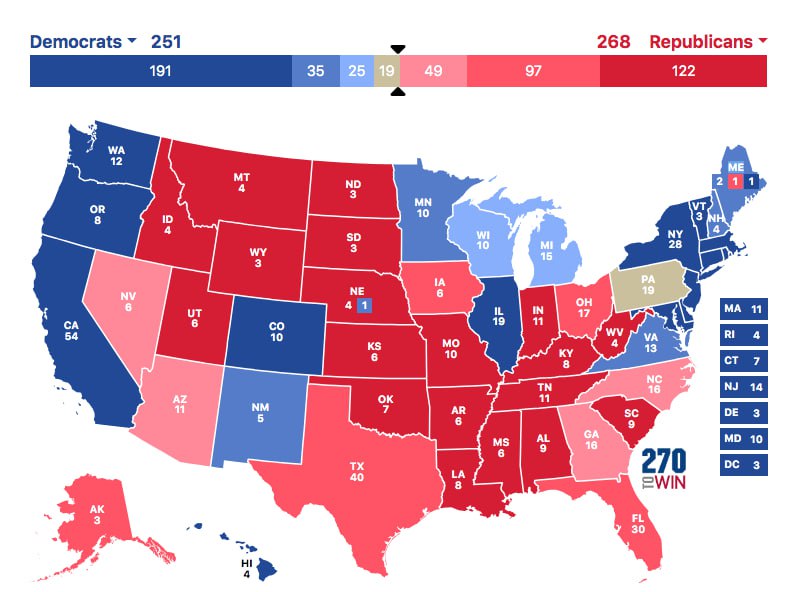 최근 여론조사에서는 대체로 해리스 부통령이 미시간과 위스콘신에서 오차범위 내 우위인 것으로 나타나지만, 펜실베이니아는 안갯속이다. 해리스 부통령이 당선되기 위해서는 전통적으로 민주당 텃밭인 펜실베이니아(선거인단 19명), 미시간(15명), 위스콘신(10명) 등 북부 3개 주를 모두 가져가 선거인단 270명을 확보해야 한다.